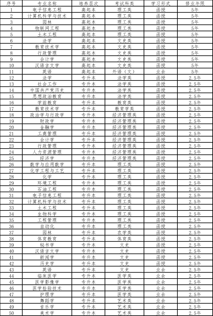 2.专升本:学制2.5年,修业年限:2.5—4.5年。